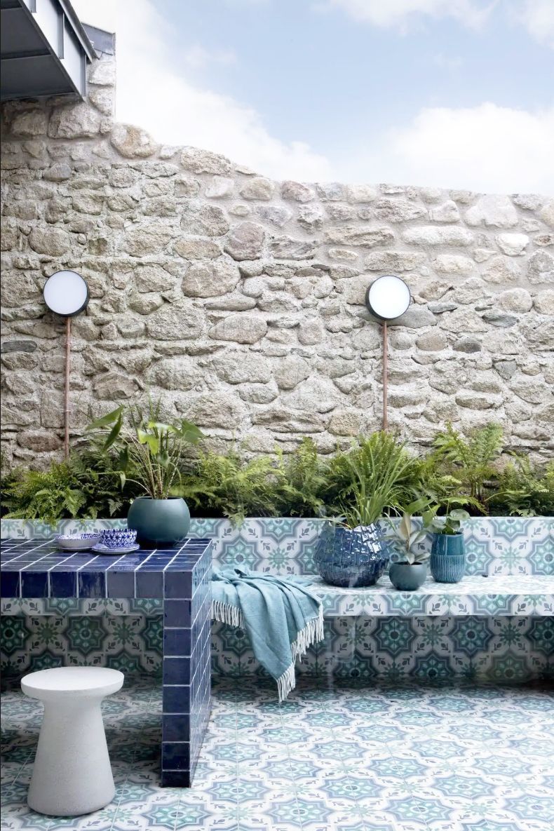 You could opt for classic wood decking or you could take a cue from this Kingston Lafferty–designed patio and really make a splash. The whimsical tiles bring so much joy and buoyancy to the space while the modern sconces and cobalt blue table add a little edge.