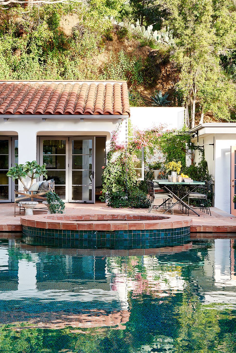 The pool is the clear focal point of this majestic backyard designed by Nickey Kehoe. The deep aqua tiles and lush canopy of trees surrounding the home set the scene while the terracotta patio tiles and understated furniture contrast just enough.